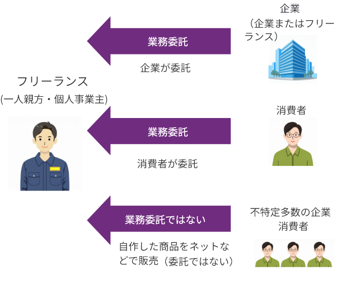 企業等がその事業のために他の事業者に、物品の製造、情報成果物の作成(プログラミング 等)、役務の提供(通訳 等) を委託することをいいます。