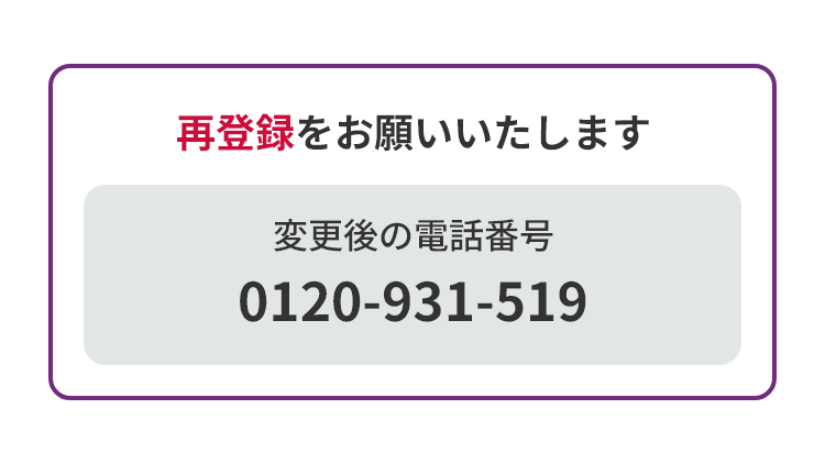 【お願い】 携帯電話等に旧電話番号をご登録されているお客様は、大変お手数をおかけいたしますが、「0120-931-519」へのご再登録をお願いいたします。